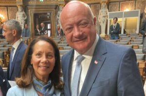 Karen Dresbach with Chancellor of Austria Christian Stocker and Foreign Minister Beate Meinl-Reisinger at the 80th Commemoration for the victims of National Socialism in the Austrian Parliament. May 15, 2025
