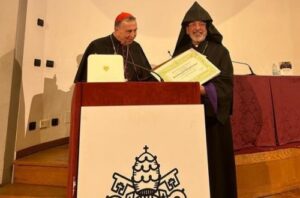 January 2024 – ROME, ITALY: Cardinal Kurt Koch, Prefect of the Dicastery for Promoting Christian Unity, on behalf of His Holiness Pope Francis presented the Benemerenti Medal of Honor to ACF VP Archbishop Khajag Barsamian for his committed work for Christian Unity and his efforts deepening the relationship between the Armenian Church and the Catholic Church. January 27, 2024