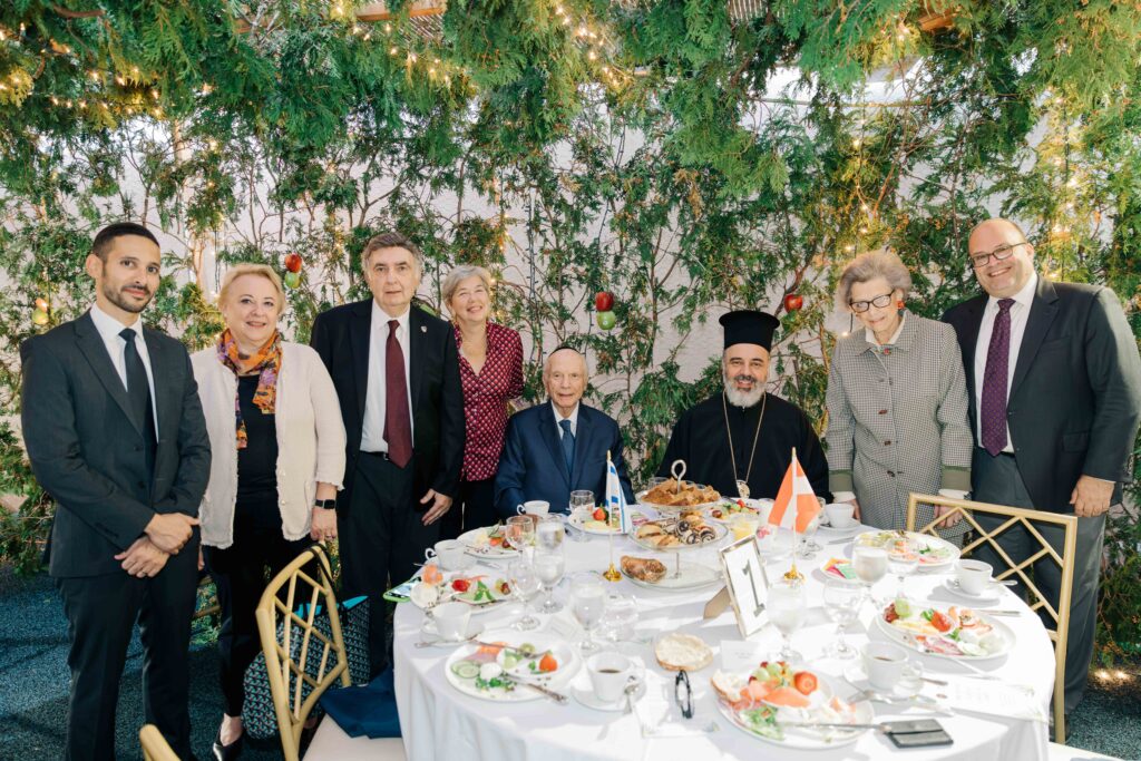 October 3, 2023 – NEW YORK, NY: Diplomats and religious leaders gather in the Park East Synagogue Sukkah (pictured left-right) Hon. Tsach Saar, Acting Consul General of Israel; H.E. Helene Steinhäusl, Consul General of Austria; Rabbi Joseph Potasnik, Executive Vice President of The New York Board of Rabbis; Rachel Neumark Herlands, Committee Co-Chair for the Lincoln Square Synagogue; Rabbi Arthur Schneier; His Grace Bishop Athenagoras of Nazianzos, Chief Secretary, Holy Eparchial Synod & Director, Department of Religious Education of the Greek Orthodox Archdiocese of America; Mrs. Elisabeth Schneier; and Rabbi Elie Weinstock, President of The New York Board of Rabbis.