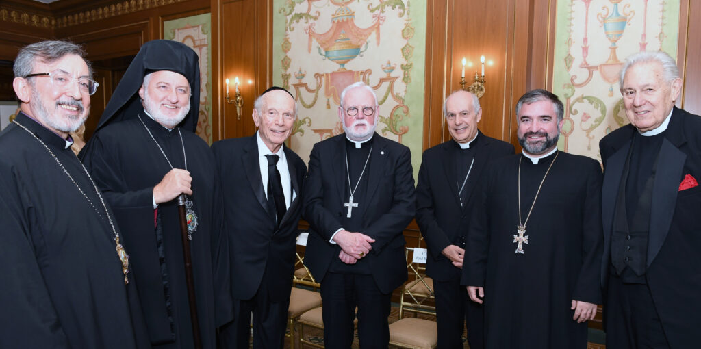 L to R:  H.E. Khajag Barsamian, Pontifical Legate of the Armenian Church of Western Europe, Envoy of the Holy Etchmiadzin to the Vatican, VP, Appeal of Conscience Foundation; H.E. Archbishop Elpidophoros, Primate of the Greek Orthodox Archdiocese of America, Trustee, ACF; Rabbi Arthur Schneier, Founder and President, Appeal of Conscience Foundation; H.E. Archbishop Paul Richard Gallagher, Secretary for Relations with States of the Vatican; H.E. Archbishop Gabriele Caccia, Permanent Observer of the Holy See to the United Nations; His Grace Bishop Mesrop Parsamyan, Primate of the Armenian Church of America, Trustee, ACF.
